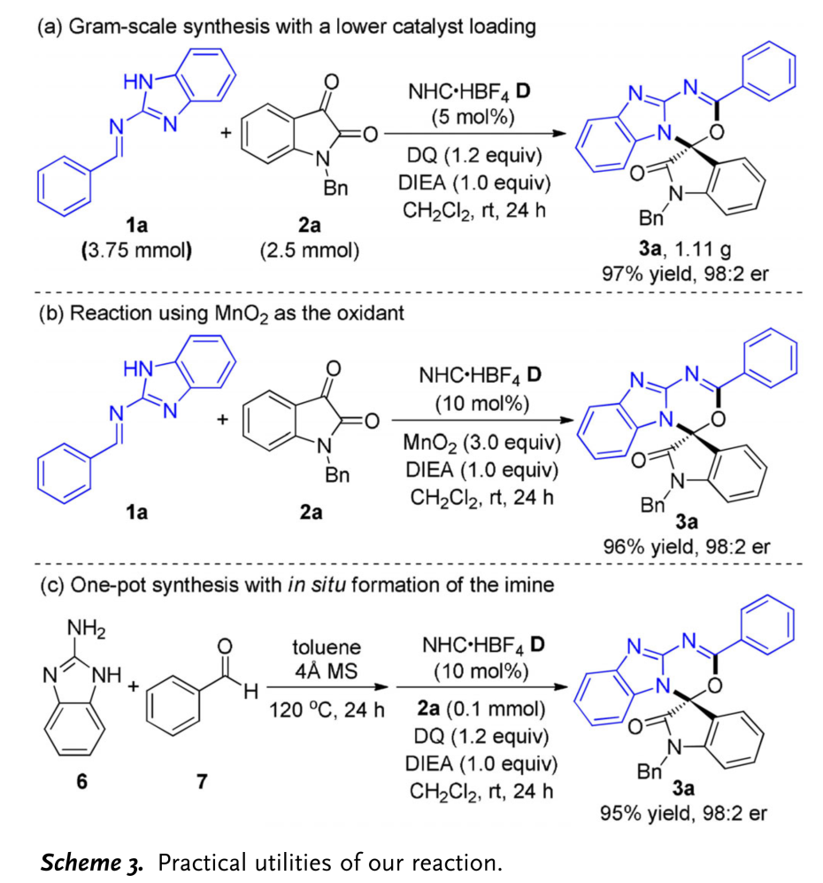同时,该小组进一步研究表明,将2a的用量扩大至2.5mmol时,上述的[4+2]环加成反应同样能够有效地进行,并获得优良的反应收率与对映选择性 (Scheme 3a)。此外,研究发现,有机氧化剂DQ能够通过更为廉价的无机氧化剂MnO2进行替代 (Scheme 3b)。同时,该小组将胺6与苯甲醛7原位产生的亚胺1进一步采用一锅反应,最终获得相应目标产物3a (Scheme 3c)。