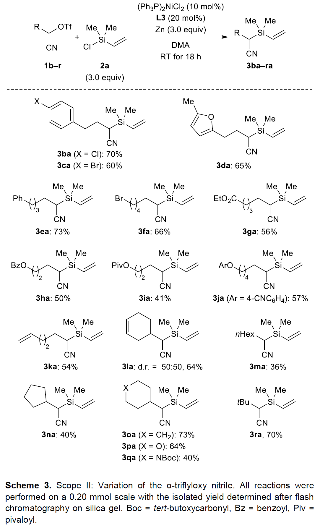 接下来,该小组采用乙烯基氯硅烷2a作为亲电硅底物,对α-三氟甲磺酰氧基腈的底物适用范围进行进一步研究 (Scheme 3)。实验结果表明,芳环中带有卤素取代基的α-三氟甲磺酰氧基腈底物,能够获得中等产率的目标产物3ba与3ca,并且,未观察到芳卤片段参与偶联过程,形成C(sp2)-Si键。此外,上述反应条件对于带有呋喃基取代的α-三氟甲磺酰氧基腈底物,同样能够获得相近收率的目标化合物 (3da,65%)。同时,该小组发现,增加脂肪链的长度,同样能够获得较为理想的实验结果 (3ea,73%)。之后,作者同样对偶联过程中α-三氟甲磺酰氧基腈底物中的官能团兼容性进行深入考察,结果发现,上述反应条件对于一级溴代烷基 (1f)与一系列烷氧羰基官能团取代的α-三氟甲磺酰氧基腈底物 (1g–1j)以及具有不饱和烯键的α-三氟甲磺酰氧基腈底物 (1k与1l)均能够良好地兼容,并获得中等至良好的产物收率。然而,作者进一步发现,上述反应条件对于线性烷基取代的α-三氟甲磺酰氧基腈底物,则仅获得较低的反应收率 (3ma,36%)。然而,对于二级与三级烷基取代的α-三氟甲磺酰氧基腈底物,却能够表现出良好的反应活性 (3na–3ra)。