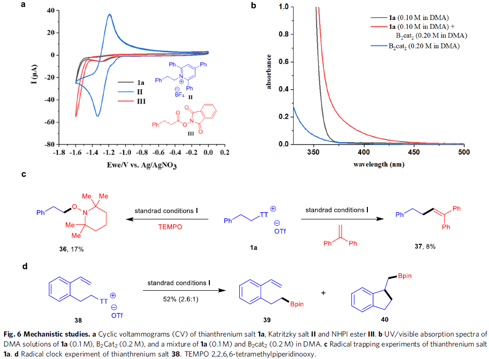 反应机理研究(Fig. 6)。首先,作者对带有苯乙基的噻蒽鎓盐1a、Katritzky盐II以及NHPI酯III进行相关的CV (cyclic voltammogram)研究 (Fig. 6a)。实验观察到,噻蒽鎓盐1a能够显示出不可逆的还原曲线,其中Ered= -1.28 V (versus Ag/AgNO3),因此,与Katritzky盐II(Ered= -1.33 V, versus Ag/AgNO3)以及NHPI酯III(Ered= -1.30 V, versus Ag/AgNO3)相比,1a更易进行相应的还原过程。同时,通过对比1a、B2cat2以及1a与B2cat2混合物的吸收光谱,能够发现相关混合物的吸收光谱出现红移,进而表明反应过程中,能够形成EDA (electron-donor-acceptor)配合物(Fig. 6b)。之后,作者发现,在可见光辐射条件下,采用使用TEMPO或1,1-二苯基乙烯作为自由基捕获剂,能够检测并分离出相应的自由基捕获产物36与37(Fig. 6c)。同时,该小组发现,底物38的脱硫硼化过程,能够形成主要产物39,同时,伴随环化产物40的产生(Fig. 6d)。综上的实验事实表明,反应过程中能够产生相应的烷基自由基中间体。此外,该小组通过“明/暗”实验 (“light/dark”experiment)的研究,进一步表明,可见光为实现上述转化过程的关键因素。接下来,作者通过对产物1c形成过程中,量子产率(Ф = 46)的测定,进一步证实,上述的硼化反应过程中涉及自由基链反应步骤。