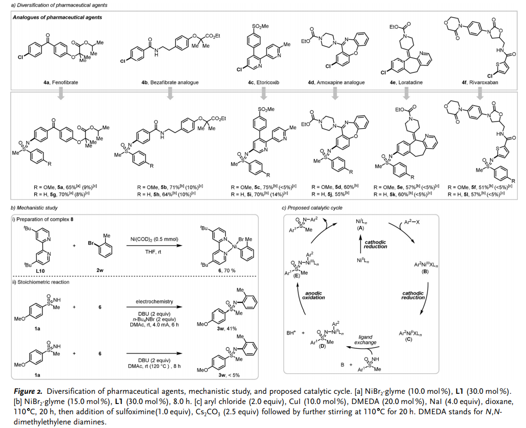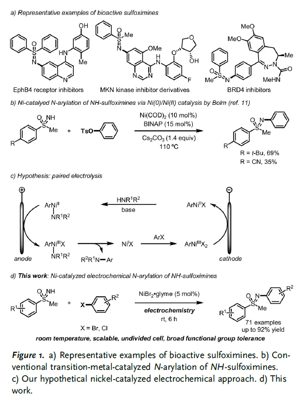 上海有机化学研究所的梅天胜团队报道首例采用Ni催化剂参与的NH-亚砜亚胺与芳基溴以及芳基氯之间的电化学N-芳基化反应方法学,并获得良好至优良反应收率的亚砜亚胺基衍生物 (sulfoximidoyl derivative)。上述策略具有操作简单实用、反应条件温和以及优良的官能团兼容性等优势,并能够进一步应用于医药相关化合物的多样化修饰。