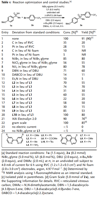 首先,作者采用NH-亚砜亚胺1a与芳基溴2a作为模型底物,进行相关反应条件的优化筛选。进而确定最佳的反应条件为: 采用5.0 mol% NiBr2·glyme作为催化剂, 6.0 mol% di-OMebpy (4,4′-二甲氧基-2,2′-联吡啶)L1作为配体,2 eq. DBU作为碱,2 eq.n-Bu4NBr作为电解质,反应溶剂为 DMAc,反应温度为室温,在无隔膜电解槽 (undivided cell)中,采用泡沫镍 (Ni foam)作为阴极,RVC (reticulated vitreous carbon)作为阳极,控制电流为4.0 mA的条件下进行电解,6h后,能够以90%的分离收率,获得相应的N-芳基亚砜亚胺3a产物 (Table1,entry 1)。