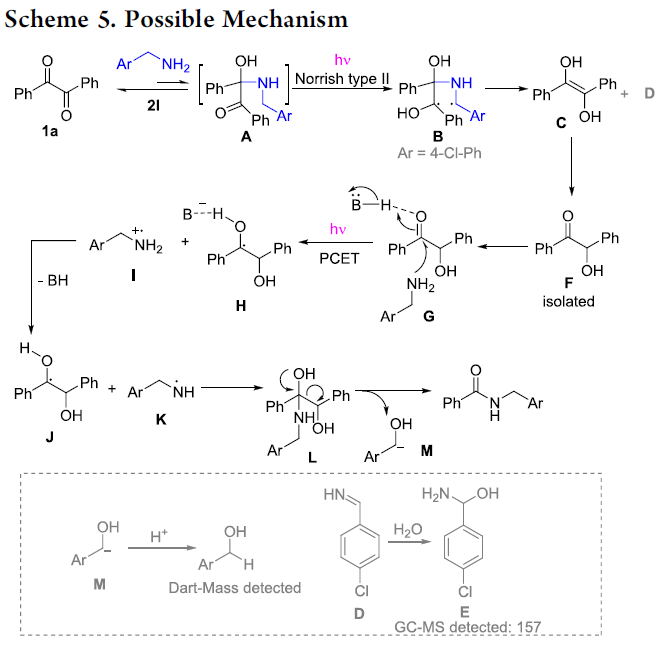 基于上述的控制实验研究,作者提出一种可能的反应机理 (Scheme 5)。首先,4-氯苄胺2l与二酮化合物1a通过亲核加成过程,形成中间体A。接下来,在紫外辐射条件下,通过中间体A的Norrish II型反应过程,形成自由基中间体B,之后,中间体B经历碎片化过程,迅速转化为烯醇化合物C(通过后续的互变异构化步骤,形成中间体F)与中间体D(能够进一步与H2O反应,形成中间体E)。接下来,胺对中间体F中的羰基进行进攻,同时,在紫外辐射条件下,通过PCET (proton-coupled electron transfer)过程,进一步形成自由基H与自由基正离子I,之后,自由基H与自由基正离子I进一步转化为自由基J与K。接下来,氮自由基K与碳自由基J进一步结合,形成四面体中间体L,并通过中间体L的消除过程,获得预期的酰胺产物。