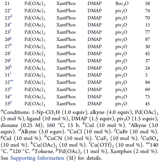 首先,作者采用萘甲酸与4-甲氧基苯乙炔作为模型底物,进行相关偶联反应条件的优化筛选 (Table 1)。进而确定最佳的反应条件为:采用5 mol% Pd(OAc)2作为催化剂,10 mol% Xantphos作为配体,DMAP作为碱,同时加入piv2O作为添加剂,二氧六环作为反应溶剂,反应温度为160oC,最终获得92%收率的偶联产物。