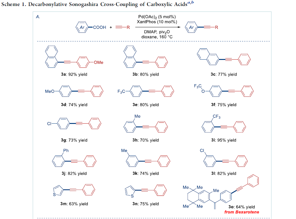 之前,本课题组已经成功开发出一系列采用羧酸底物参与的脱羰交叉偶联反应方法学[5]。在上述策略中,通过羧酸的原位活化,形成混合酸酐,之后,通过低价金属试剂对C(O)-OR键的选择性氧化加成以及后续的脱羰过程[6],形成芳基-金属中间体,再经历还原消除过程,即可获得相应的偶联产物 (Figure 1)。受到上述研究报道的启发,这里,作者成功设计出一种采用钯催化剂参与的羧酸脱羰Sonogashira交叉偶联反应方法学策略。