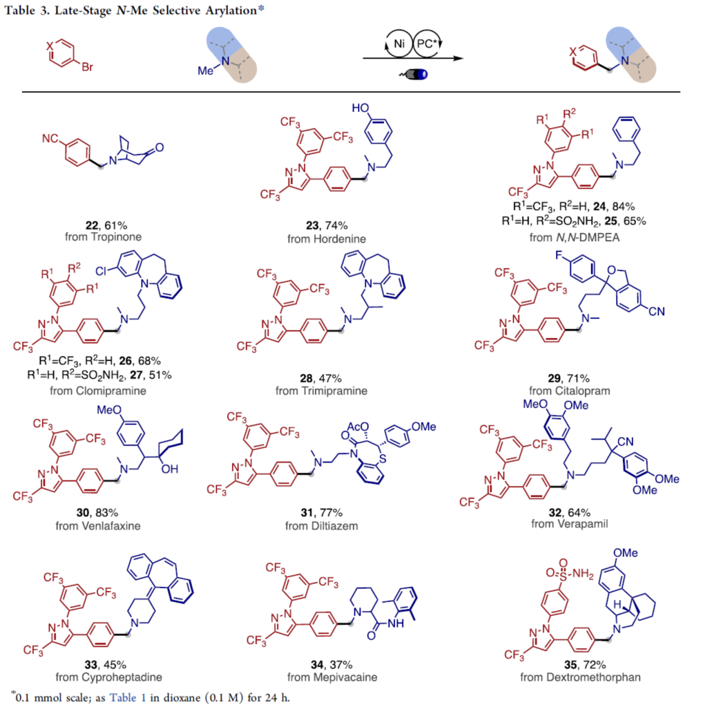 为进一步研究上述α-芳基化方法学的合成应用价值,接下来,作者对一系列具有三烷基胺结构单元的药物与天然产物分子进行相关的后期官能团化反应研究 (Table 3)。实验表明,通过这一全新的N-甲基选择性α-芳基化策略,能够顺利完成一系列通过常规策略难以获得,并具有一定药学应用价值的苄基二级烷基胺分子22–35的构建 (37-84% 收率)。