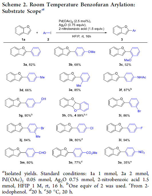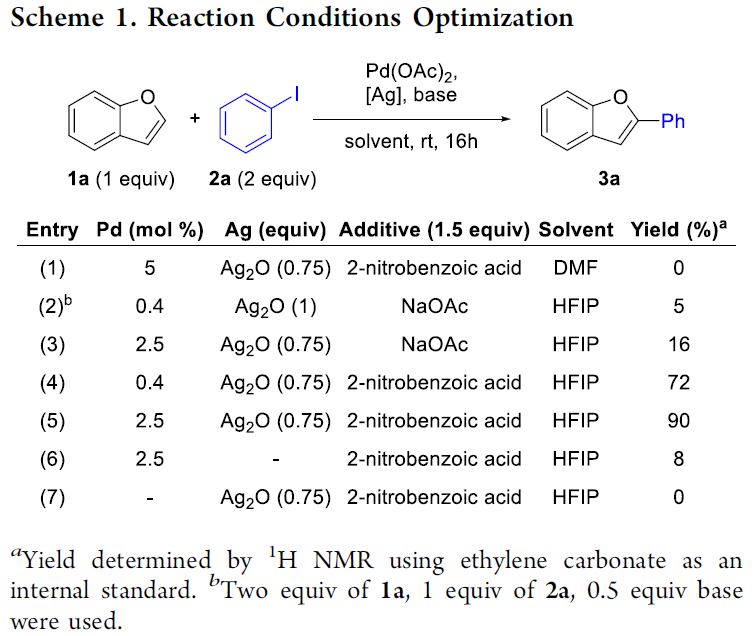 首先,作者采用苯并呋喃化合物1a与碘苯2a作为模型底物,进行了相关反应条件的优化筛选 (Scheme 1)。进而确定最佳的反应条件为:采用Pd(OAc)2作为催化剂,Ag2O作为银盐前体,2-硝基苯甲酸作为添加剂,在六氟异丙醇 (HFIP)溶剂中,室温条件下进行反应,最终获得90%收率的偶联C-H芳基化产物3a。