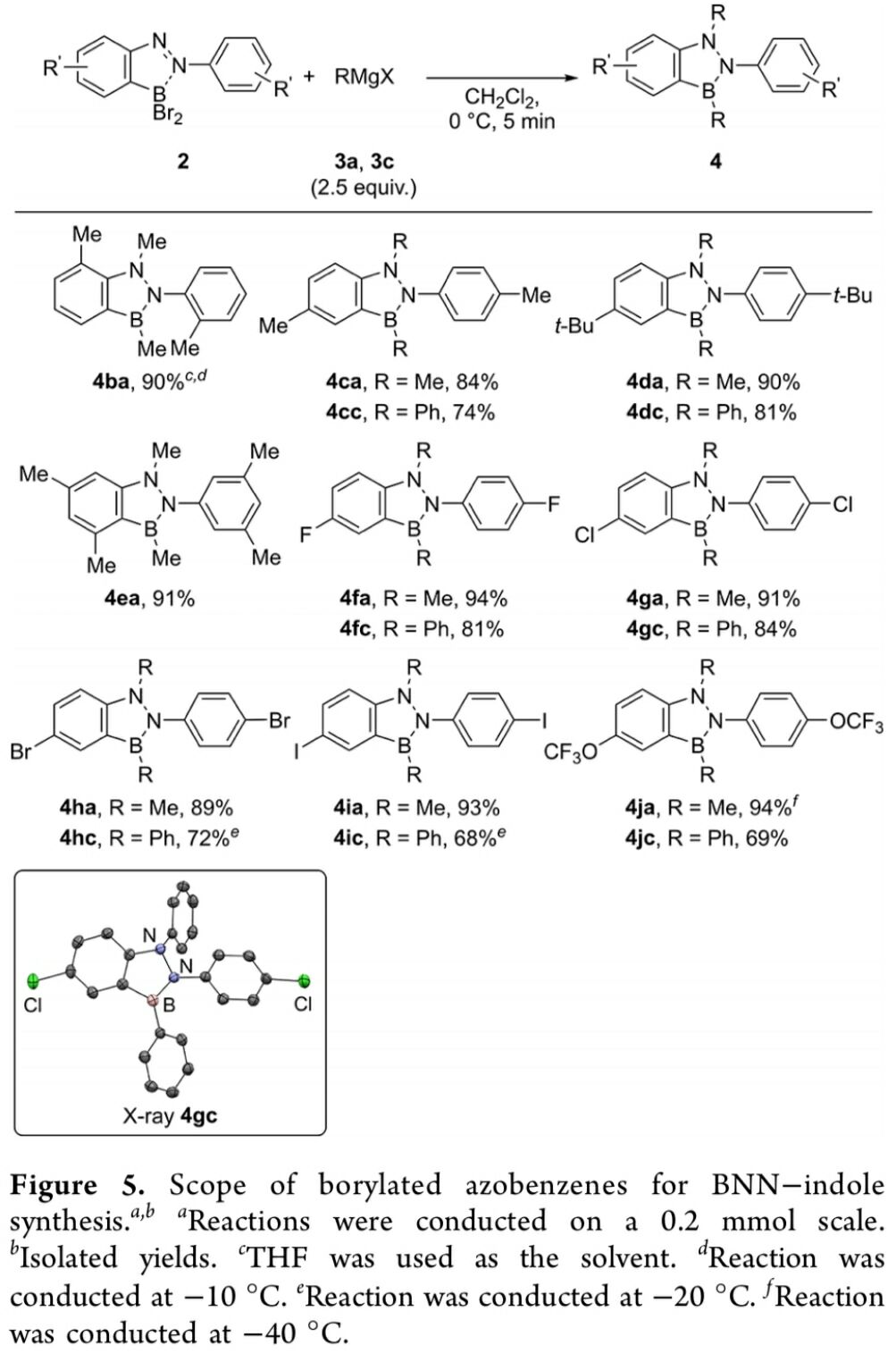 Y. Kondo与M. Shigeno研究团队成功开发出一种选择偶氮苯作为起始原料,通过采用BBr3进行的邻位硼化以及采用Grignard试剂进行的二烷基化关环的两步反应过程,进而成功完成一系列BNN吲哚分子的构建。之后,作者通过对NICS值的计算表明,带有B-N-N键的五元杂环分子,具有中等程度的芳香性。同时,作者通过进一步的实验研究表明,硼化偶氮苯化合物的关环过程的反应机理主要涉及通过Grignard试剂对底物中偶氮基团的亲核加成与分子内关环,以及后续涉及B-Br键的亲核取代过程。