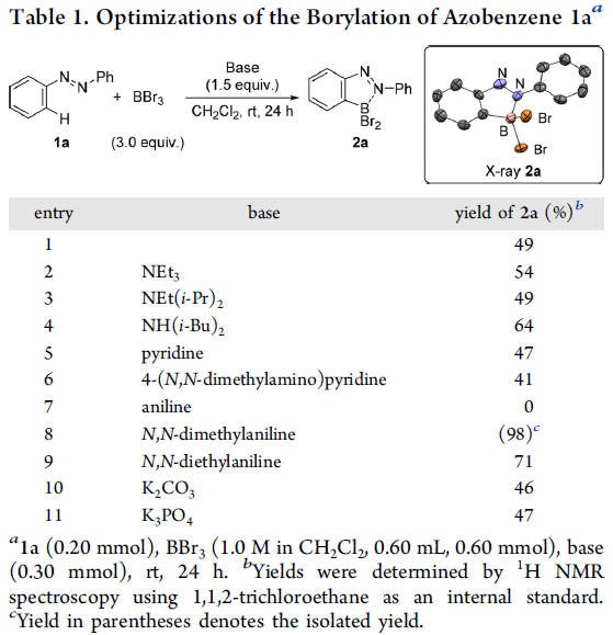 首先,作者采用偶氮苯1a与BBr3作为模型底物,进行亲电硼化反应条件的优化筛选 (Table 1)。进而确定最佳的反应条件为:采用N,N-二甲基苯胺作为碱,在二氯甲烷溶剂以及室温条件下进行反应,最终获得98%收率的硼化产物2a。