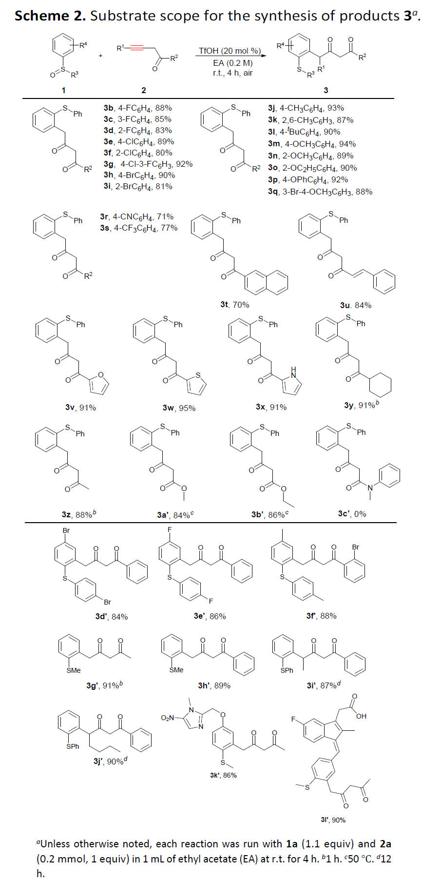 首先,作者采用1a与2a作为模型底物,进行相关反应条件的优化筛选 (Table 1)。进而确定最佳的反应条件为:采用TfOH作为催化剂,乙酸乙酯作为反应溶剂,反应温度为室温。最终以高度的区域选择性以及92%反应收率,获得相应的γ-芳基化产物3a。