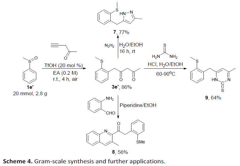 同时,该小组进一步对上述γ-芳基化方法学的合成应用价值进行深入研究(Scheme 4)。首先,作者发现,将底物1e’的用量扩大至20 mmol时,同样能够成功获得86%收率的目标产物3e’。并且,该小组进一步发现,通过3e’作为关键砌块,能够进行多种不同类型的合成转化过程,进而成功实现一系列具有重要应用价值的杂环分子的构建。