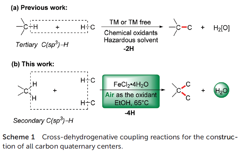 南开大学徐大振课题组成功设计出一种通过具有二级C(sp3)-H键的有机底物构建全碳四级中心的CDC反应策略。这一全新的CDC策略中,采用铁(II)盐FeCl2•4H2O作为催化剂,空气中的氧气作为终端氧化剂。同时,这一全新的CDC策略具有反应条件温和,优良的化学选择性,无需相应的配体以及碱的参与等优势。并且,这一全新的CDC方法学为一系列具有全碳四级中心的3,3-二取代羟吲哚分子的构建,开辟出一条更为简洁有效的反应途径。