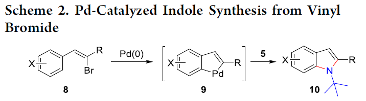这里,受到本课题组前期对于二氮杂环丙酮与环钯(II)中间体作用,形成含氮杂环分子相关研究 (Scheme 1)[2]–[4]的启发,本文中,作者成功设计出一种通过廉价易得的乙烯基溴作为起始原料,进而以良好的反应收率,顺利完成一系列吲哚分子的构建 (Scheme 2)。