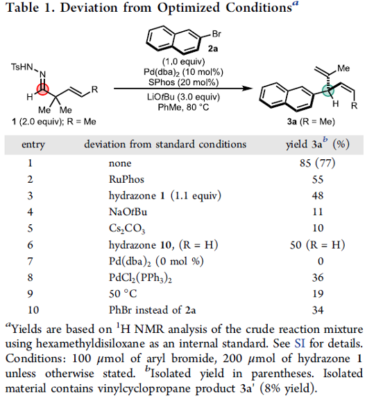 同时,作者采用腙(E)-1与萘基溴2a作为模型底物,进行相关反应条件的优化筛选 (Table 1)。进而确定最佳的反应条件为:采用Pd(dba)2作为催化剂,SPhos作为配体,LiOtBu作为碱,甲苯作为反应溶剂,反应温度为80oC,最终获得85%收率的Z-SD (Z-skipped diene)产物3a ((Z)-3a:3′=10:1)。
