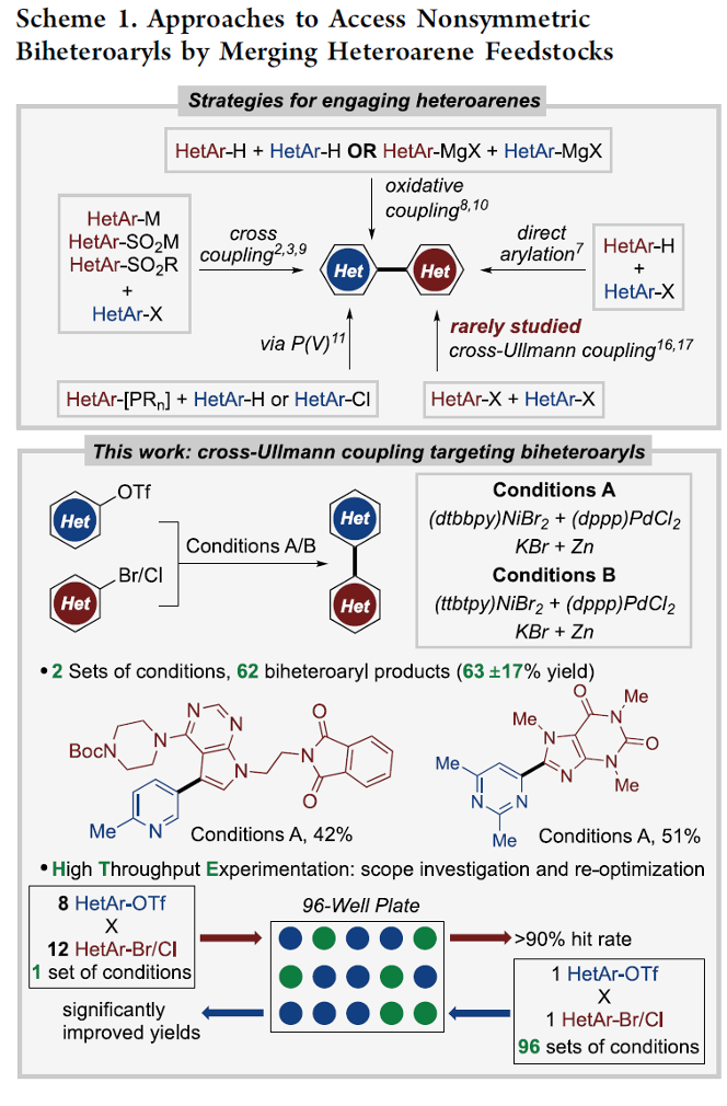 Wisconsin-Madison大学的D. J. Weix课题组报道一种全新的通过Ni与Pd催化剂促进的杂芳基卤与杂芳基三氟甲磺酸酯之间的多金属交叉Ullmann偶联反应 (multimetallic cross-Ullmann coupling)方法学,进而顺利完成一系列杂环联芳分子的构建。这一全新的交叉Ullmann偶联反应方法学具有反应条件温和、底物范围广泛以及高度的官能团兼容性等优势。同时该小组通过高通量实验的进一步优化,进一步表明这一全新的交叉Ullmann偶联具有潜在的合成应用价值。
