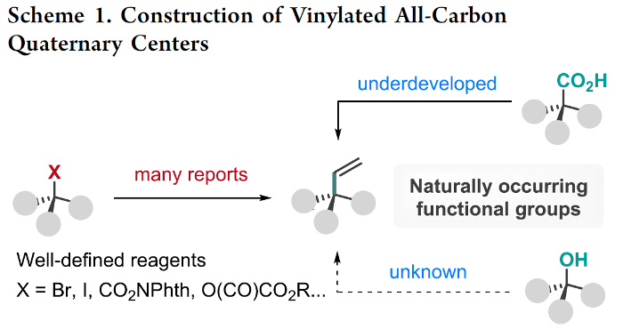 兰州大学的舒兴中课题组成功设计出一种全新的采用钛催化剂促进的通过各类三级醇分子参与的自由基去羟基乙烯基化反应方法学,进而成功完成各类具有乙烯基化的全碳四级中心有机分子的构建。这一全新的去羟基乙烯基化策略具有优良的化学与立体选择性、优良的底物应用范围以及高度的官能团兼容性等优势。