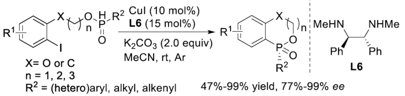 手性P-杂环化合物目前已经广泛应用于不对称催化领域的相关研究[1]。同时,对于手性P-杂环骨架构建的相关反应方法学研究,目前已经有诸多的文献报道 (Figure 1a) [2]-[3]。然而,对于具有P-立体生成中心 (P-stereogenic)的P-杂环分子构建 (Figure 1b),却较少有相关的研究报道[4]。这里,受到近年来对于催化对映选择性C-P交叉偶联/环化反应方法学相关研究报道[5]-[9]的启发,临沂大学的杨文强课题组报道一种全新的通过铜催化剂促进的H-次膦酸酯 (H-phosphinates)的动态动力学C-P交叉偶联/环化反应方法学,进而成功完成一系列具有P-立体生成中心(P-stereogenic) P-杂环分子的构建。