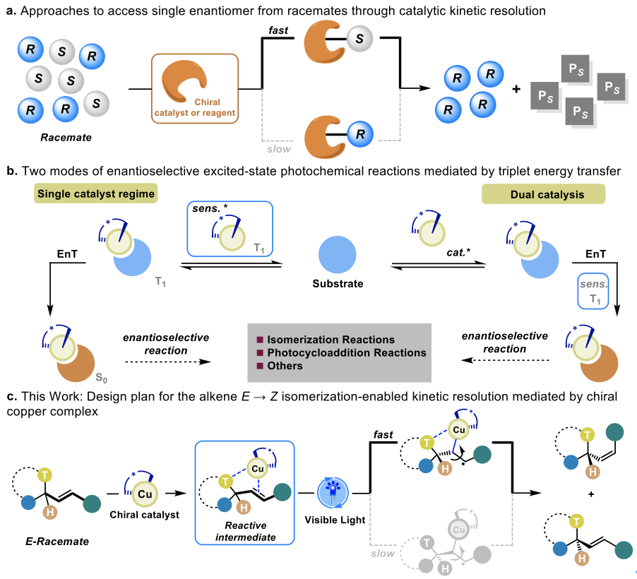由于特定烯烃分子的不同异构体(E/Z异构体、对映异构体)对手性受体识别的不同,往往在宏观上表现出不同的物理、化学以及生物学特性。基于此,如何超越生物合成模式的限制,实现烯烃化合物构型的有效控制一直以来都是有机立体化学的重点研究内容。目前,Gilmour[1]、Weaver[2]和俞寿云[3]等课题组利用可见光介导的选择性能量转移策略有效地克服了微观可逆性和基态热力学限制所带来的不利影响,已经能够较好地解决简单烯烃E→Z的有效配置。但是对于三维空间的对映选择性异构化过程来说,则仍然具有十足的挑战。在过去的几十年里,不对称合成已逐步成为构建多样化对映体富集分子的强有力工具。而外消旋混合物的动力学拆分过程,同样也是一种获得手性化合物的成熟策略(Figure 1a)。