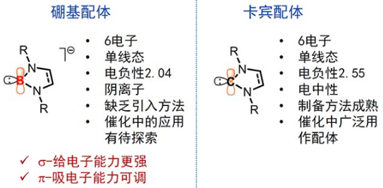 图2. 硼基配体与氮杂环卡宾配体的比较
