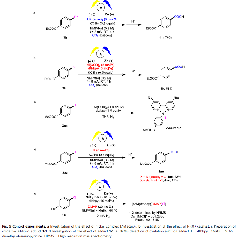 之后,作者进行一系列相关的控制实验 (Fig. 5)研究表明,1-1可能作为上述催化循环过程中的关键中间体。并且,该小组进一步通过HRMS检测到配合物1-2[ArNi(dtbbpy)(DMAP)Cl]的存在 (Fig. 5e)。
