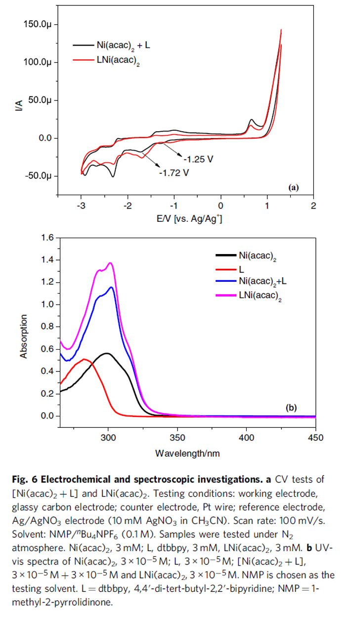 同时,作者通过对于L+Ni(acac)2与LNi(acac)2的CV以及Ni(acac)2的UV-Vis吸收光谱研究 (Fig. 6)表明,在NMP溶剂中,通过Ni(acac)2与dtbbpy之间的等比例混合,原位形成相应的预催化剂LNi(acac)2。同时,镍催化剂与配体之间存在相关的配位过程。之后,作者发现,在镍催化体系中存在两个不可逆的还原峰,进而表明镍催化剂能够在阴极表面还原为相应的Ni(I)与Ni(0)配合物。