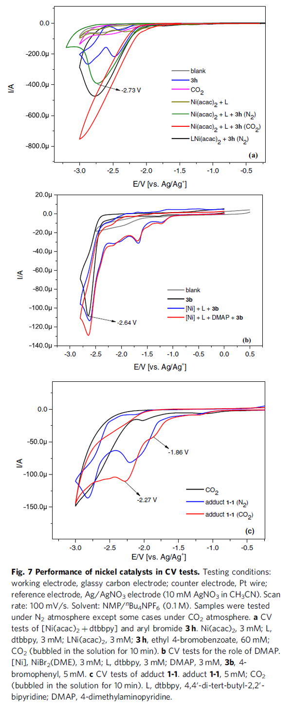 之后,该小组进一步通过对于Ni(acac)2与dtbbpy体系 (Fig. 7a)、镍催化体系与DMAP共同存在时 (Fig. 7b)以及加合物1-1的CV研究表明,预先形成的镍配合物能够进一步还原为相应的Ni(0)配合物,因而能够推测催化电流的产生源自于3h与Ni(0)配合物之间的氧化加成过程。而且,该小组研究发现,在引入CO2之后,还原峰电流进一步增加,进而表明后续羧基化反应过程的进行。同时,DMAP能够有效地促进镍催化剂对于芳基溴分子的活化。并且,反应过程中同样存在加合物1-1在阴极表面的还原 (Fig. 7c)以及氧化加成配合物1-1通过后续的还原过程,形成相应的Ni(I)配合物,再与CO2经历相应的羧基化步骤,并进一步还原为相应的Ni(0)配合物。