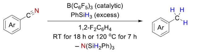近日,Berlin工业大学 (Technische Universität Berlin)的M. Oestreich课题组在Org. Lett.中发表论文,报道一种全新的通过B(C6F5)3催化剂促进的芳香腈衍生物的还原去氮化 (reductive denitrogenation)反应方法学,进而成功完成一系列取代甲苯以及其它甲基取代的芳香化合物的构建。