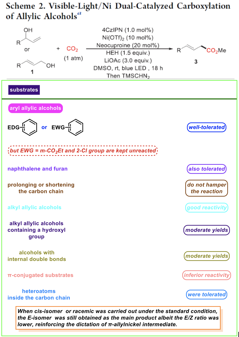 首先,作者采用烯丙醇衍生物1a与作为模型底物,进行相关反应条件的优化筛选 (Table 1)。进而确定最佳的反应条件为:采用4CzIPN作为光催化剂,Ni(OTf)2作为金属催化剂,neocuproine (L1)作为配体,CO2气体压力为1 atm,LiOAc作为添加剂,HEH (Hantzsch ester)作为还原剂,DMSO作为反应溶剂,蓝光LED辐射,反应温度为室温,最终获得71%收率的羧基化产物2a。同时,研究发现,上述的羧基化反应过程中表现出优良的区域选择性(>99:1)与良好的立体选择性 (E/Z> 15:1)。