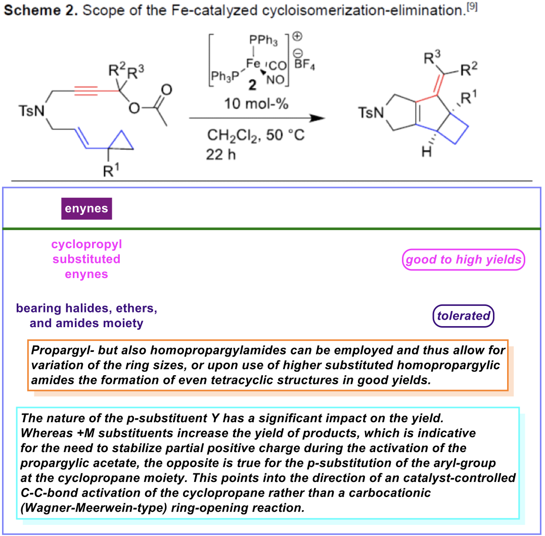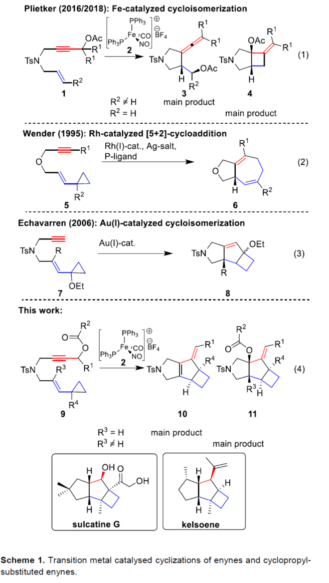 近日,德国Stuttgart大学的B. Plietker课题组在Angew. Chem. Int. Ed.中发表论文,报道一种全新的通过阳离子铁配合物促进的通过环丙基取代烯炔分子参与的环异构化反应方法学,进而成功完成一系列三环环丁烷分子的构建。