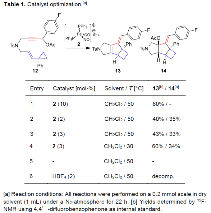 首先,作者采用环丙基烯炔衍生物12作为模型底物,进行相关反应条件的优化筛选 (Table 1)。进而确定最佳的反应条件为:采用[(Ph3P)2Fe(NO)(CO)]BF4(2)作为阳离子铁催化剂,DCM作为反应溶剂,反应温度为50oC,最终获得80%收率的环异构化产物13。