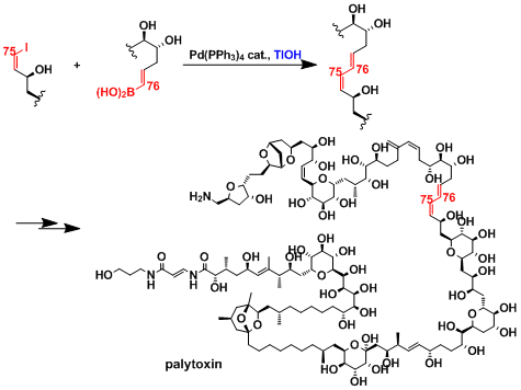 该反应因其较高的官能团选择性,实现了palytoxin的全合成。当分子的分子量变得越大,反应时与反应活性位的碰撞概率越小,一般的偶联反应很难发生。在这个合成中,氢氧化铊作为碱加入反应中对反应活性的提高显而易见。[3]