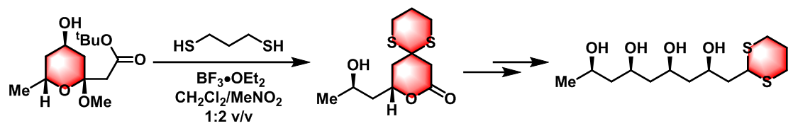 将缩酮的(175 mg, 0.46 mmol) MeNO2-DCM溶液(2:1 v/v,底物浓度为0.15 M)冷却至-45°C,之后加入1,3-丙二硫醇(3.3eq.)与BF3·OEt2。将上述反应混合物逐渐升温至0°C(升温时间超过1h)。反应结束后,将上述反应液直接采用硅胶柱色谱进行分离纯化,获得相应目标产物。