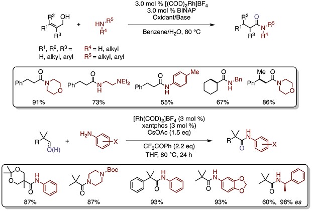 酰胺是在很多生物分子和具有生物活性的小分子中最常见的官能团。活化的羧酸衍生物与胺亲核试剂之间直接偶联的是最广泛的方法,但是还存在具有显着的固有缺点(即:产生化学计量的高分子量副产物,并且需要大量的保护基的操作)。 醛通过转移氢化的氧化官能化已成为传统偶联方法的一种最有前途的替代方法之一。 Hull小组已经证明,阳离子铑催化剂可以促进烯丙醇,烯丙胺和立体受阻的醇或醛的氧化酰胺化6-8。(Fig.3)
