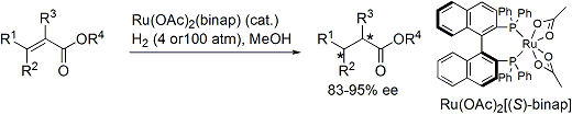 不对称合成可提供光学活性的化合物,因此是有机合成中最重要的方法学之一。野依等人,开发了实用性的不对称还原法,通过催化剂量的手性源,以简便易得的氢气作为还原剂,使该法绿色环保,且易于工业规模化。并可用于合成各类医药品・氨基酸酸等。