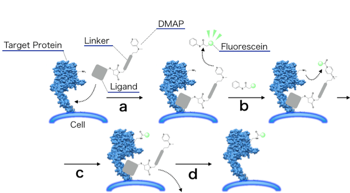 将配体与DMAP(二甲氨基吡啶)相连接,DMAP作为催化位点,将探针引入蛋白质的目标蛋白标记化方法。