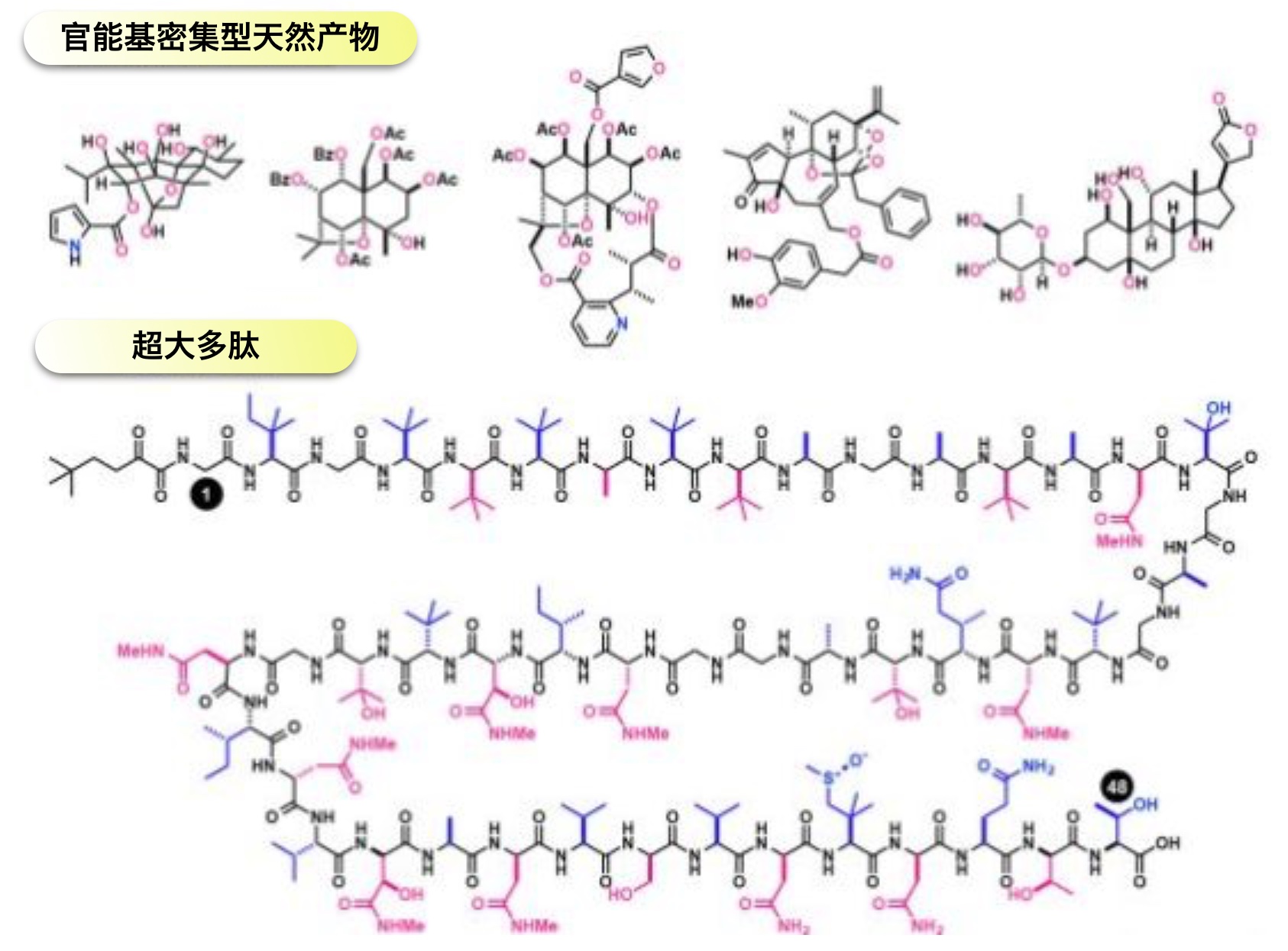 实现多含氧官能团的天然产物如:ryanodine (Ca2+ channel activator), hyponine B (anti-HIV activity); resiniferatoxin (analgesic activity); toosendanin (K+ channel inhibitor); ouabain (Na+/K+ pump inhibitor)的全合成;另一方面,井上实验室也首次实现了超大多肽分子(>5000)Polytheonamides B。