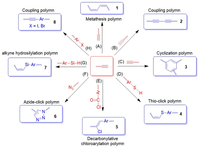 由于骨架上电子不饱和的重复单元之间的电子离域作用,炔烃聚合物具有π共轭的特性。这种独特的电子结构赋予了炔烃聚合物新奇的性质,而这些性质是电子饱和的烯烃聚合物以及其他缩聚难以实现。实现炔烃聚合物的这些极具吸引力的潜在性能的首要条件是发展合成这些聚合物的通用方法。唐本忠院士课题组一直以来都在探索基于炔烃的聚合反应新方法,并取得了一系列的成果。