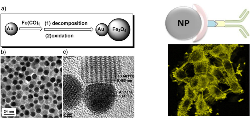 通过选择高沸点有机物作为溶剂,如二苯醚、二苄醚等,以油酸、油胺作为配体,同时加入长链烷基二醇作为调节剂(同时也是还原剂)。由乙酰丙酮铁热分解可合成以四氧化三铁为核心的尺寸均一且可调、形貌可控(球形、立方体、空心球)的磁性氧化物纳米颗粒。而以贵金属纳米颗粒作为晶种,在油酸、油胺配体存在的条件下,高温热解Fe(acac)3, 并加入长链烷基二醇。在热分解过程中通过调节Au/Fe比例、反应温度、升温速度等因素,可以分别合成出Au-Fe3O4核壳状、花状、哑铃状等不同形状的复合型磁性纳米颗粒。其中,哑铃结构材料在癌症的靶向治疗和成像方面有很好的应用前景。除此之外,孙守恒教授课题组也研究了以FePt为代表的Pt基合金磁性纳米颗粒,所得到纳米颗粒均一性好,而且形貌可调控。[2-3]