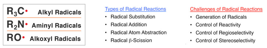 除了自由基取代和加成反应外,自有机化学还具有离子化学不具有的反应,如自由基攫取反应和自由基β-裂解,因此越来越受到合成化学家们的关注。实际上,自由基化学在复杂天然产物合成中也有广泛应用(有机所李昂——自由基课件)。自由基相较与离子化学,有以下优点:在温和条件和中性环境下可以较高速率发生反应,并且有好的官能团耐受性;自由基链式反应相较容易发生和可控,可用于高效构建具有多手性中心的复杂分子。与此同时,自由基化学也有自身的缺点:自由基的产生;反应性的调控,包括反应性,区域选择性、对映选择性等。