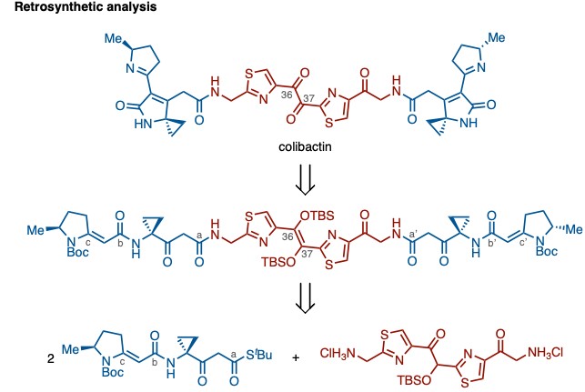 作为结直肠癌的病原体,Colibactin是由人肠道内细菌产生的次级代谢产物。然而,由于难以通过培养和提取细菌来分离Colibactin,其分子结构尚不清楚。Herzon教授与耶鲁大学Crawford教授合作,基于生物合成基因簇分析,有机合成,串联质谱和元素标记方法的连用,确定了Colibactin的结构[2]。