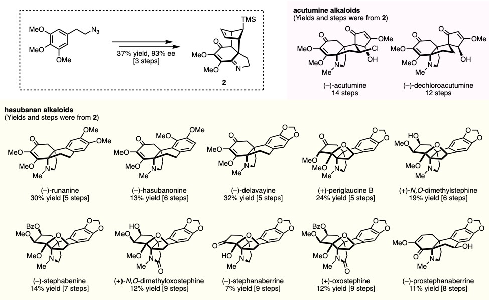 Herzon教授还实现了Hasubanan和Acutumine生物碱的合成[5]。以3步即可得到的化合物2为高级中间体,经5-9步即可合成多种Hasubanan生物碱。此外,以2为中间体的两种Acutumine生物碱合成也有过报道。
