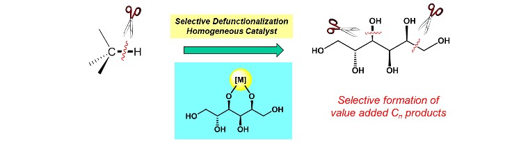 大量廉价的生物基质可以从自然中获得,如农业废物、森林产品、农作物残留物或水生生物量,所有这些都是有机碳的可持续来源。虽然生物化合物的结构部分主要由纤维素、半纤维素和木质素组成,但他们的水解产物葡萄糖可被还原得到由天然产物衍生化合物,如糖醇。。因此,这些底物的选择性去功能化提供了生物基化合物,如碳氢化合物、甲醇、高分子量烷烃、烯烃和甲烷。虽然氢解可用来裂解生物衍生多元醇(糖和糖醇)的C-C和C-O键,但目前的方法是需要高温高压甚至非选择性的苛刻条件下使用多相催化剂来实现这一过程。因此,Chang教授团队将专注于选择性催化系统的开发并将其在温和条件下应用于对生物衍生的基质化合物的可控性转化,并为物质衍生的平台化学品的利用开辟新途径。(scheme 3)