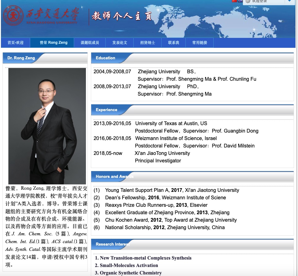 曾荣教授,西安交通大学理学院教授。曾荣教授主要从事有机合成方法学、金属有机络合物化学、环境与能源化学等相关研究。自开展研究工作以来,本人先后在J. Am. Chem. Soc, Angew. Chem. Int. Ed., ACS Catal.等国际权威期刊上发表文章13篇,总引用次数过400次。
