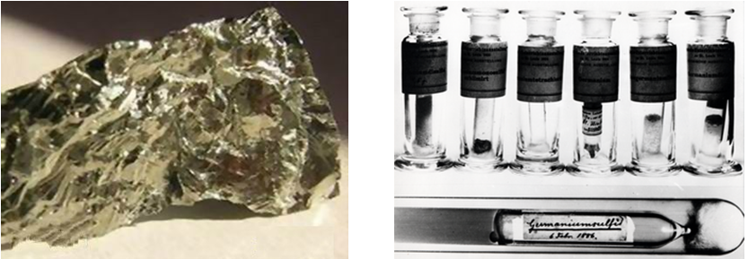 锗在发现之前就已被预测存在,门捷列夫于1871年就预言其存在,并将其命名为“类硅”(ekasilicon)。[2]1886年,德国弗莱贝格矿业学院分析化学教授Clemens A. Winkler在分析夫赖堡附近发现的一种新的矿石——argyrodite(辉银锗矿4Ag2S·GeS2)的时候,利用光谱分析法发现了一种新的元素,并通过实验验证了自己的推断。尽管新元素单质有点类似砷和锑在外观,但其性质与门捷列夫的预测类硅相符。这种新元素就是锗元素。它被命名为germanium,以纪念发现锗的发现者Clemens A. Winkler的祖国德国。元素符号定为Ge。[3]