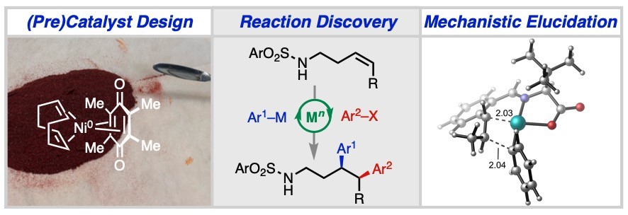 1.催化剂设计:均相催化领域创新的一个主要驱动力是辅助配体的设计,该配体与金属结合,可以促使金属中心具有所需的反应性,选择性和稳定性。 作为化学家,配体是我们“过渡态的手”,使我们能够通过分子水平的控制来操纵中间态和过渡态的稳定性。 在Engle的实验室中,我们通过结合有机金属合成,结构表征和DFT计算来进行配体和催化剂设计。过去十年见证了均相镍催化研究的复兴。使用镍的兴趣源于其在许多催化转化中(包括钯催化的交叉偶联)可作为贵金属的廉价替代品的能力,以及其促进独特类型的键构建的能力,范围从C-H活化到烯烃官能化。Engle实验室一步合成18电子的镍(0)的金属有机配合物 Ni(COD)(DQ)1(图 1)。该金属有机配合物有以下几种优点:1)一种对热、空气、湿气稳定;2)是各种镍催化反应有效的预催化剂;3)以预催化剂的形式参与构建C-C,C-N,C-B键。
