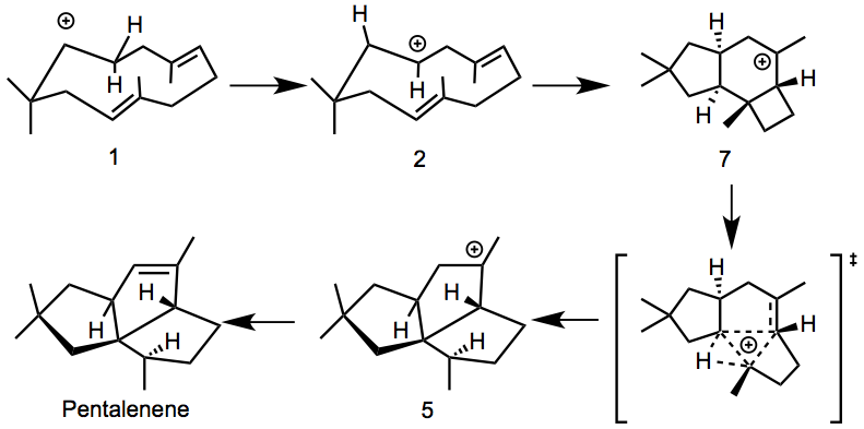 并环萜烯(Pentalenene)是由多种放线菌(Streptomyces chromofuscus, S. griseochromogenes, S. baarnensis)产生的倍半萜类化合物。并环萜烯是针对革兰氏阳性菌、阴性菌、霉菌等具有抗生活性的抗生物质–戊丙酯菌素(Pentalenolactone)的生物合成中间体,并环萜烯1980年由瀬戸治男成功分离得到。(文献1)。从生物合成的观点来看,关于这一特征的三并五元环骨架(triquinane structure)是如何形成的,已经展开了许多研究。(多个并五元环结构单元被称为polyquinane类化合物、因环的数目不同分为diquinane、triquinane等。)