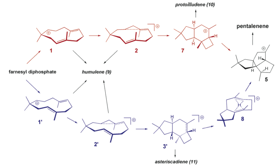 天然产物界权威化学家David Cane一直致力于并环帖烯的生物合成研究。Cane等人是1983年从放线菌提取物中加入氚标记的FPP,追踪其生物合成机理(文献2)。所得结果,见下图,由此得知该合成是通过FPP酶环化得到并环萜烯。
