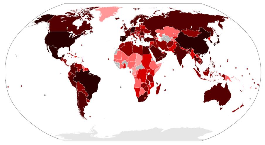 2009年全球爆发的甲型H1N1流感疫情图(颜色越深疫情越严重)