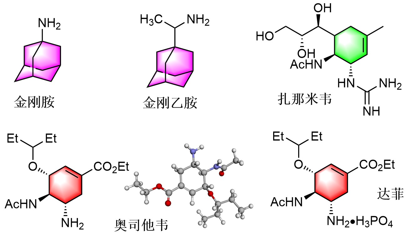 目前市场上使用的抗流感药物主要有两类:一类是上市于20世纪六七十年代的金刚烷胺类,包括金刚胺(Amantadine)和金刚乙胺(Rimantadine),该类药物是M2离子通道抑制剂,能干扰病毒在细胞中的脱壳过程,但只对A 型流感病毒有效,并且已产生严重的耐药性;另一类是神经氨酸酶抑制剂,包括奥司他韦(Oseltamivir)和扎那米韦(Zanamivir),这类药物则对A型和B 型流感病毒均有很强的抑制作用。