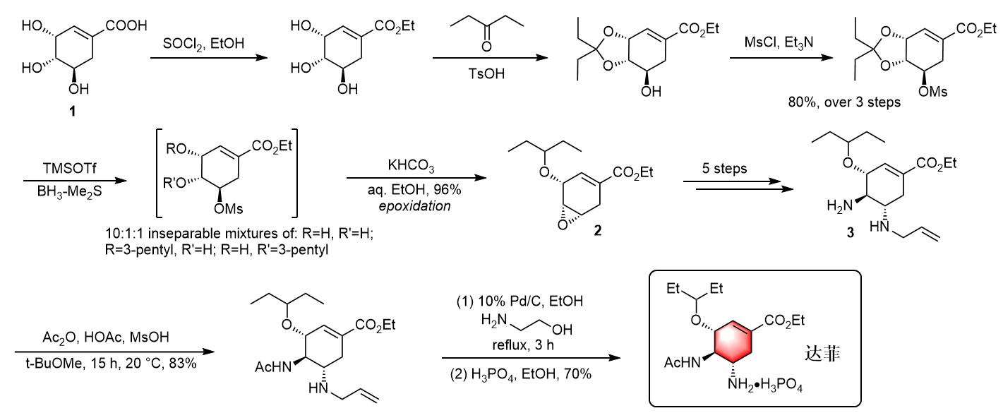 罗氏公司的合成路线从莽草酸(1)开始,酯化后利用3-戊酮对邻二醇进行保护,另一个游离羟基与甲磺酰氯作用后成为更好的离去基团便于后续反应。缩酮经硼烷还原后得到比例不同的三种不可分离异构体,不经纯化即可直接进行环氧化反应得到环氧中间体产物(2)。随后,利用烯丙胺进行开环、脱烯丙基、亚胺生成、转移亚胺化、水解等步骤成功构建中间体(3),最后经伯胺乙酰化和脱烯丙基保护得到奥司他韦,加入磷酸成盐即可得到最终产物达菲。