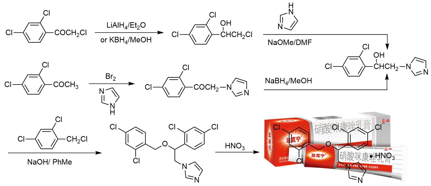 商品化的咪康唑药物主要是它的硝酸盐形式,由西安杨森制药公司(Janssen Pharmaceutical)研制而成。咪康唑的合成路线主要有两条,不同之处在于引入咪唑基团的起始原料和方法不同。总体而言,两条路线均需要涉及羰基还原和饱和碳原子上的亲核取代反应,咪唑基团引入后通过经典的Williamson醚合成法可以顺利得到咪康唑,最后只需酸化成盐即可。